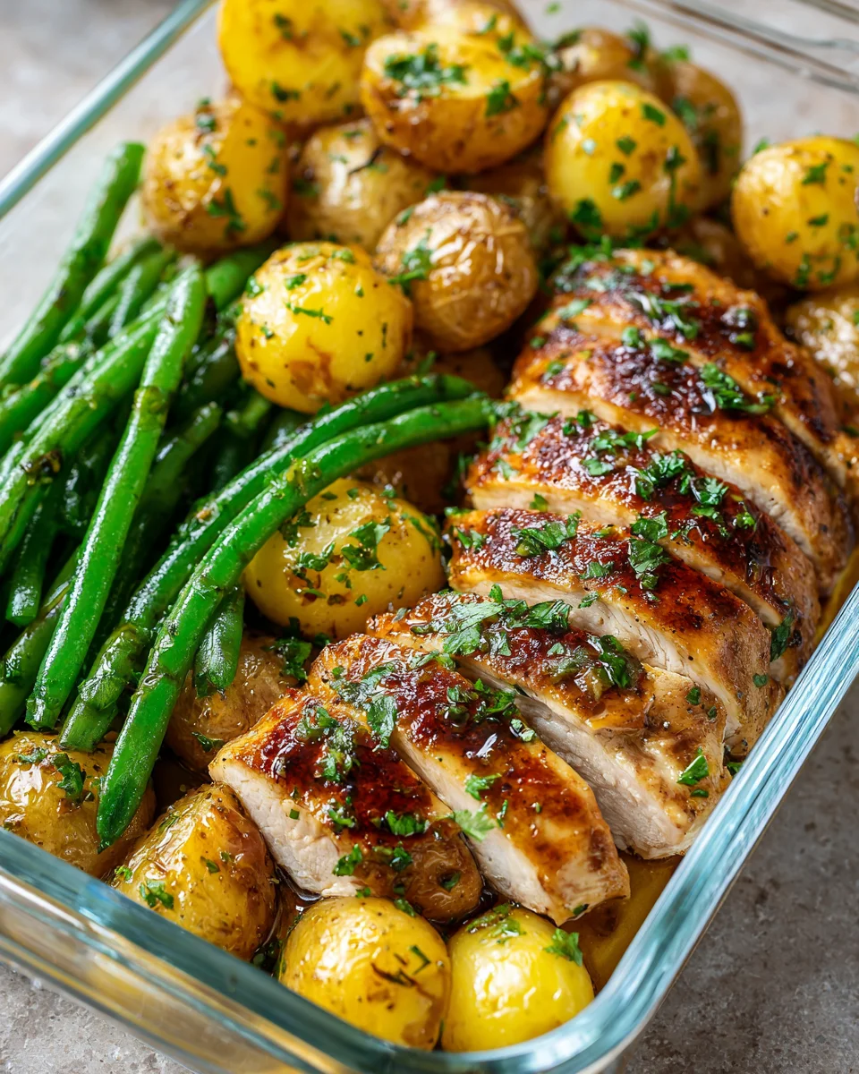 A vibrant and flavorful meal prep dish featuring lemon-garlic marinated chicken served with roasted yellow potatoes.