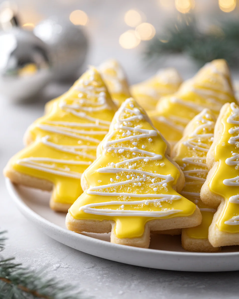 Soft lemon-infused sugar cookies shaped like Christmas trees and topped with a bright lemon icing and festive decorations.