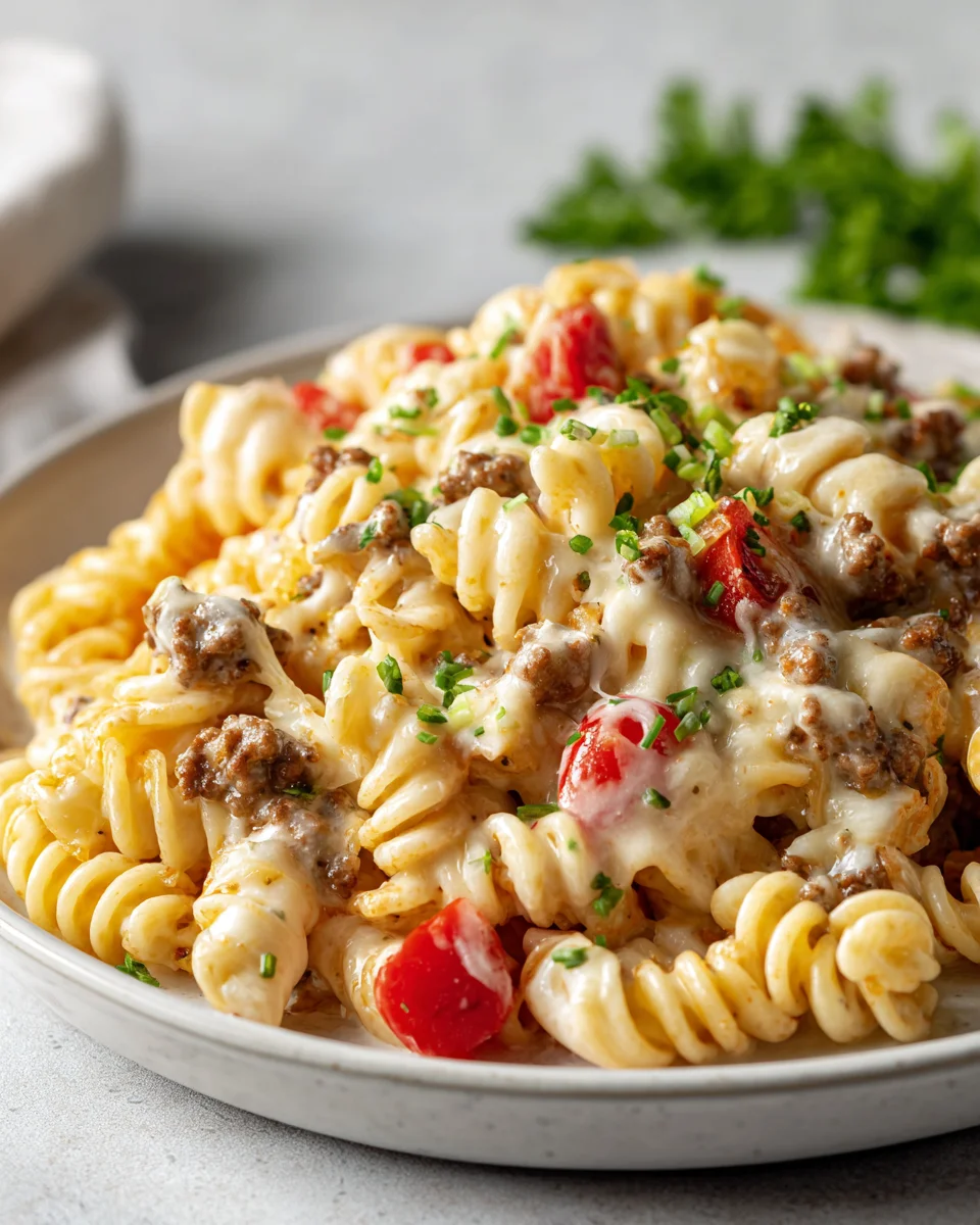 A creamy, savory dish that combines the flavors of a cheeseburger with Alfredo pasta.