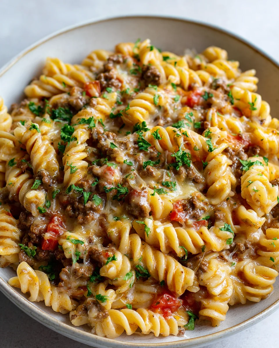 A creamy pasta dish combining the flavors of a cheeseburger with Alfredo sauce.