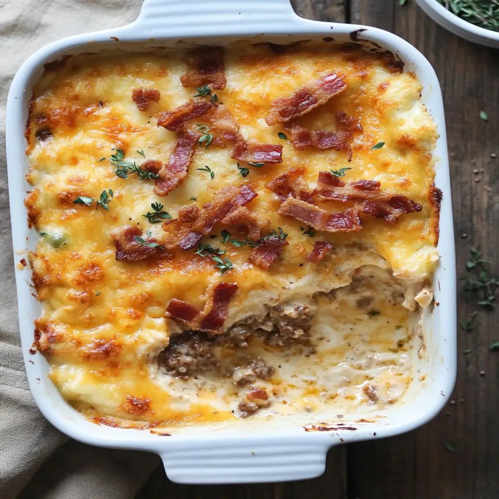 A hearty and cheesy Low-Carb Bacon Cheeseburger Casserole made with ground beef, bacon, eggs, and cheese for the ultimate keto-friendly comfort food.