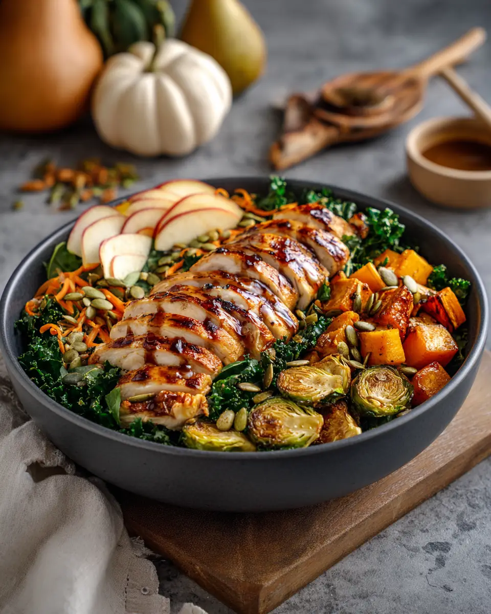 Every forkful delivers a satisfying blend of flavors and textures. The chicken is juicy with a smoky grilled finish, the kale is hearty and earthy, while roasted Brussels sprouts bring a nutty caramelization. Butternut squash adds a subtle sweetness, balanced by the tangy crunch of fresh apple slices. Pumpkin seeds add a salty crunch, while the dressing—whether balsamic glaze, tahini, or a vinaigrette—ties everything together. It’s a perfect harmony of savory, sweet, and fresh.