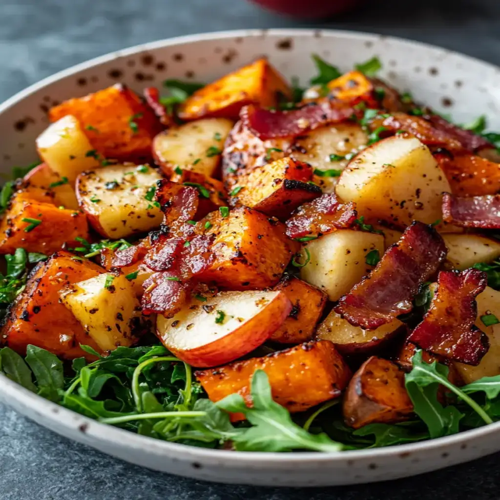 A hearty fall salad featuring maple-roasted sweet potatoes, crisp apples, smoky bacon, toasted pecans, and fresh greens tossed in a maple-balsamic vinaigrette.