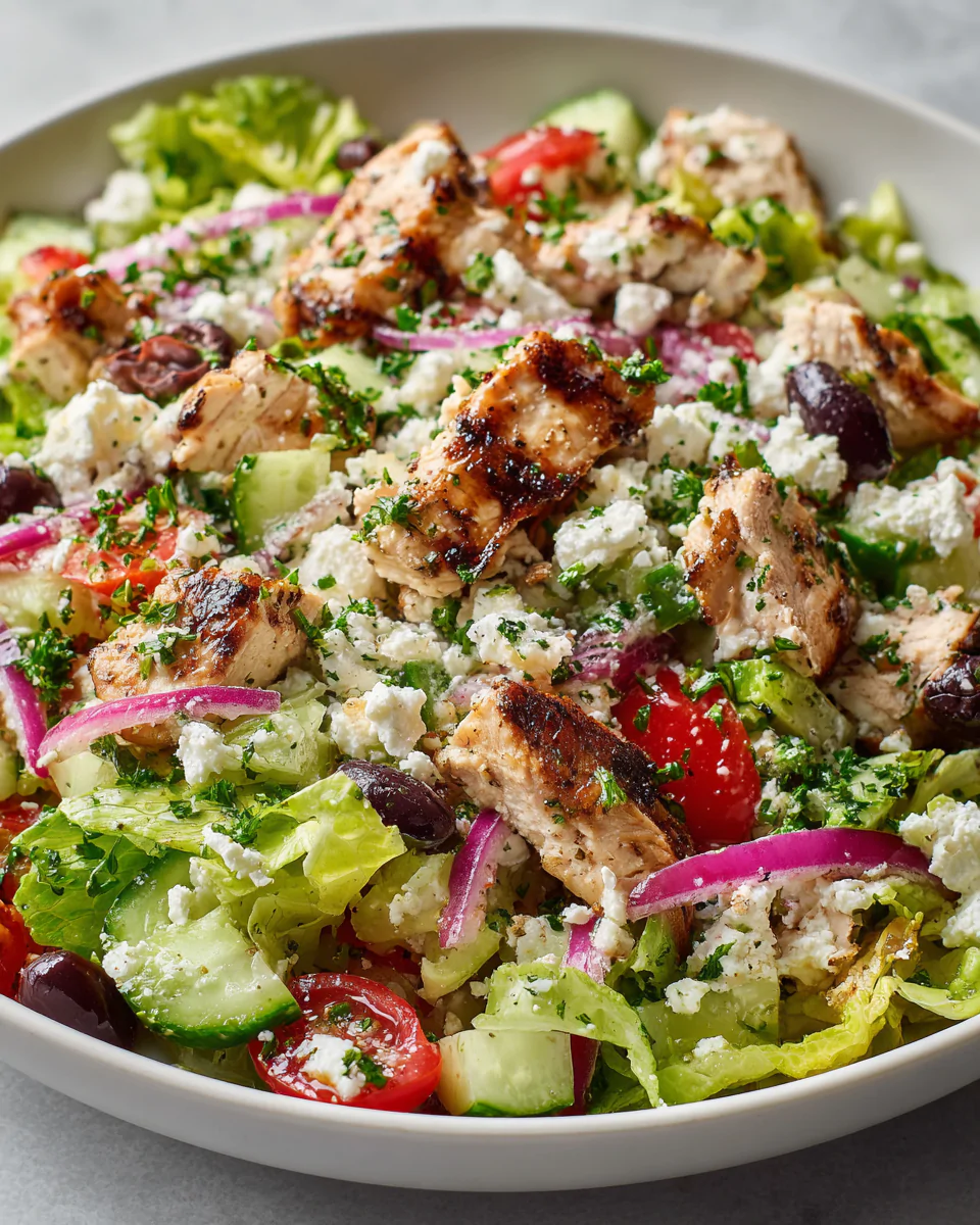 A fresh and satisfying Mediterranean chopped salad made with seasoned chicken, crisp vegetables, feta cheese, and a bright lemon olive oil dressing.