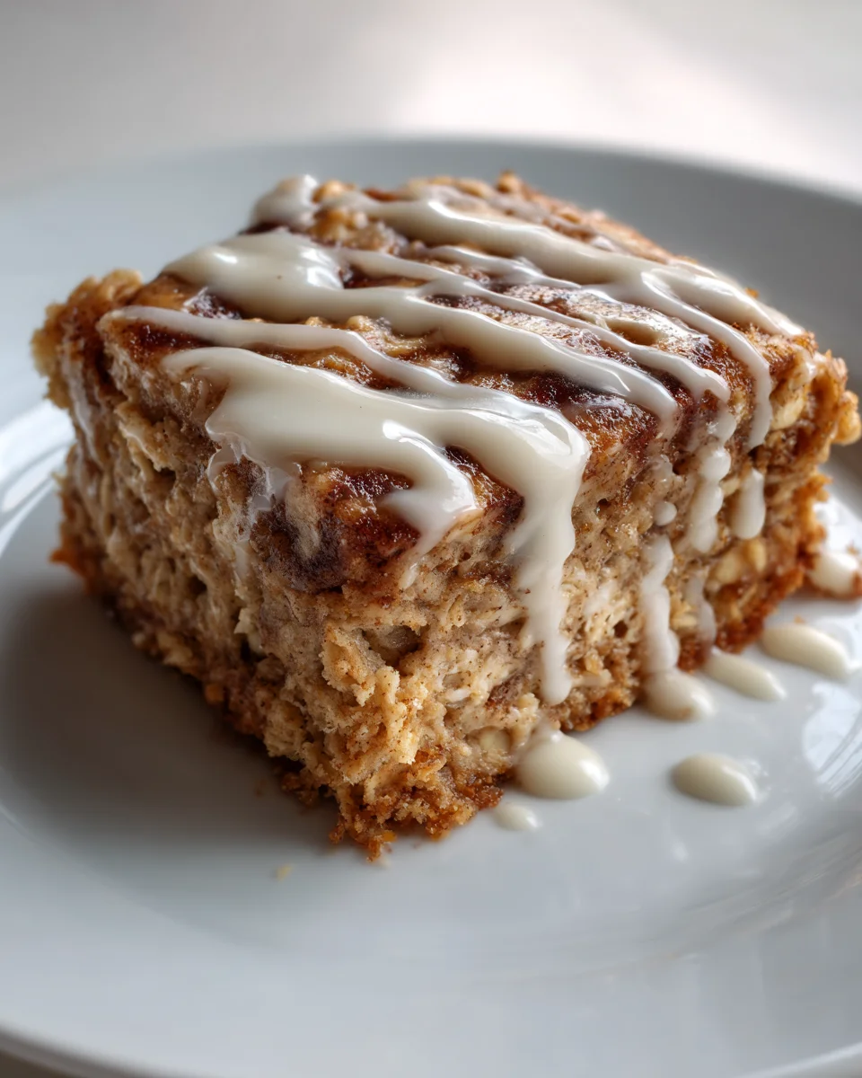 A soft, melt-in-your-mouth baked oatmeal inspired by classic cinnamon rolls, packed with protein and finished with a creamy glaze for a comforting yet nourishing breakfast.