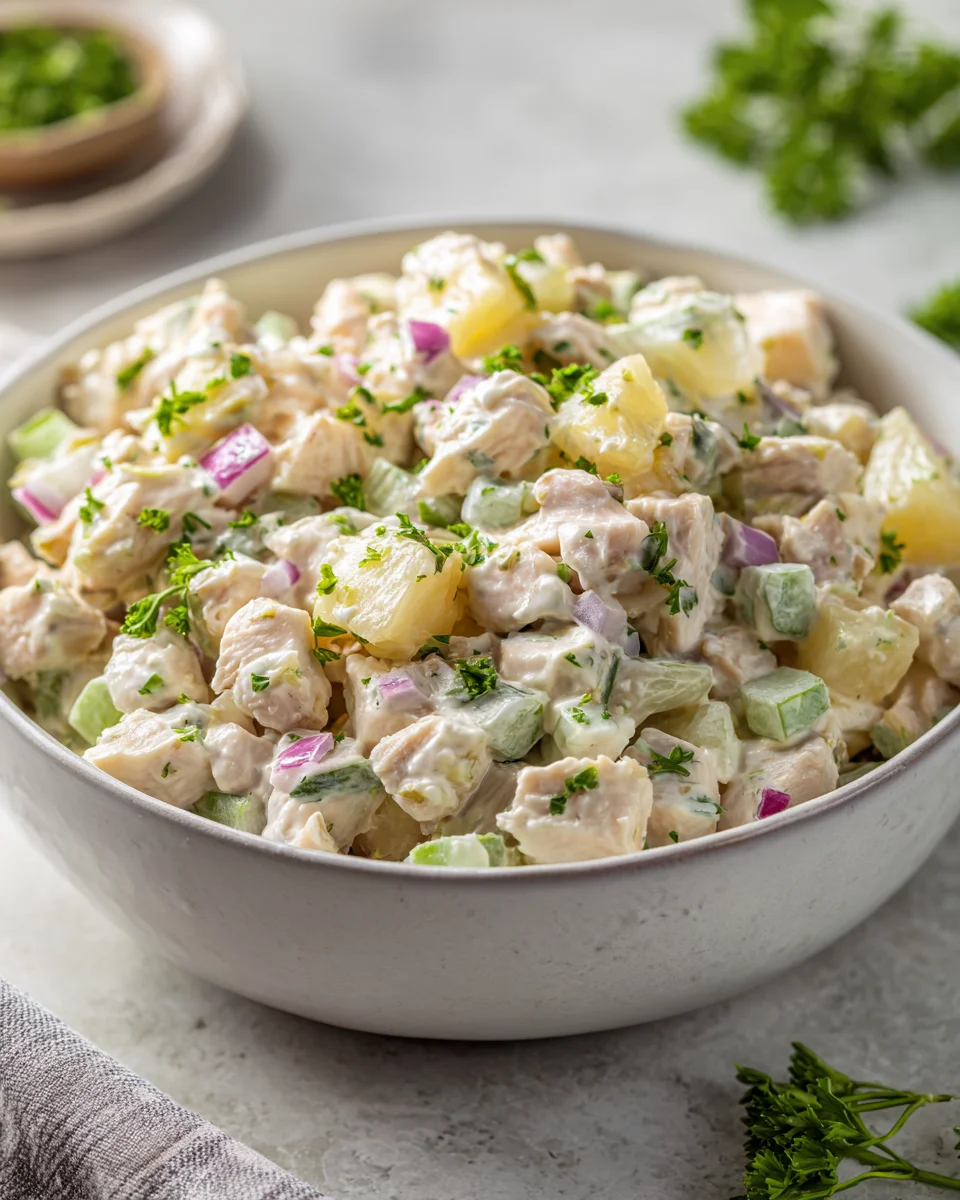 What makes this dish so special, you ask? It’s the magical combination of textures and flavors that will transport your taste buds straight to paradise. We’re talking about succulent, tender chicken perfectly complemented by bursts of sweet, juicy pineapple. This isn’t just any chicken salad; it’s a vibrant, tropical escape for your palate, balancing savory goodness with a delightful sweetness that’s simply irresistible.