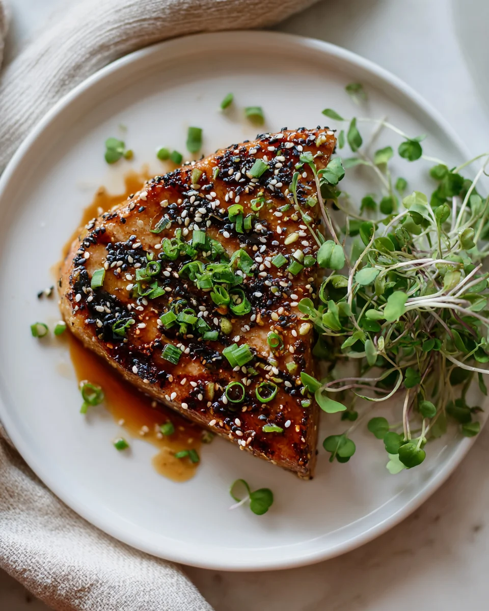 Succulent grilled tuna steaks marinated in a savory ginger-sesame sauce, offering a delightful blend of nutty, savory, and aromatic flavors with a beautiful sear.