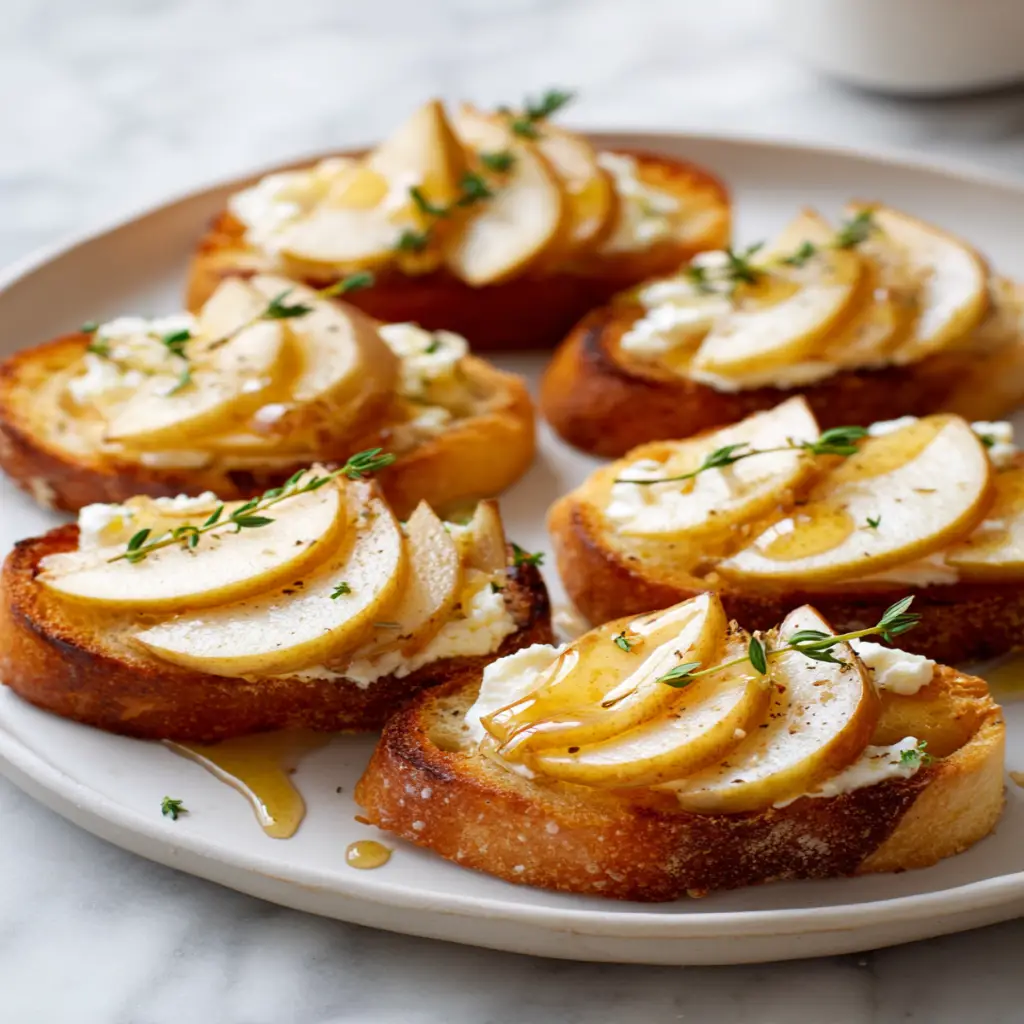 An elegant appetizer made with toasted baguette slices topped with creamy goat cheese, fresh pear slices, a drizzle of honey, and a sprinkle of herbs.