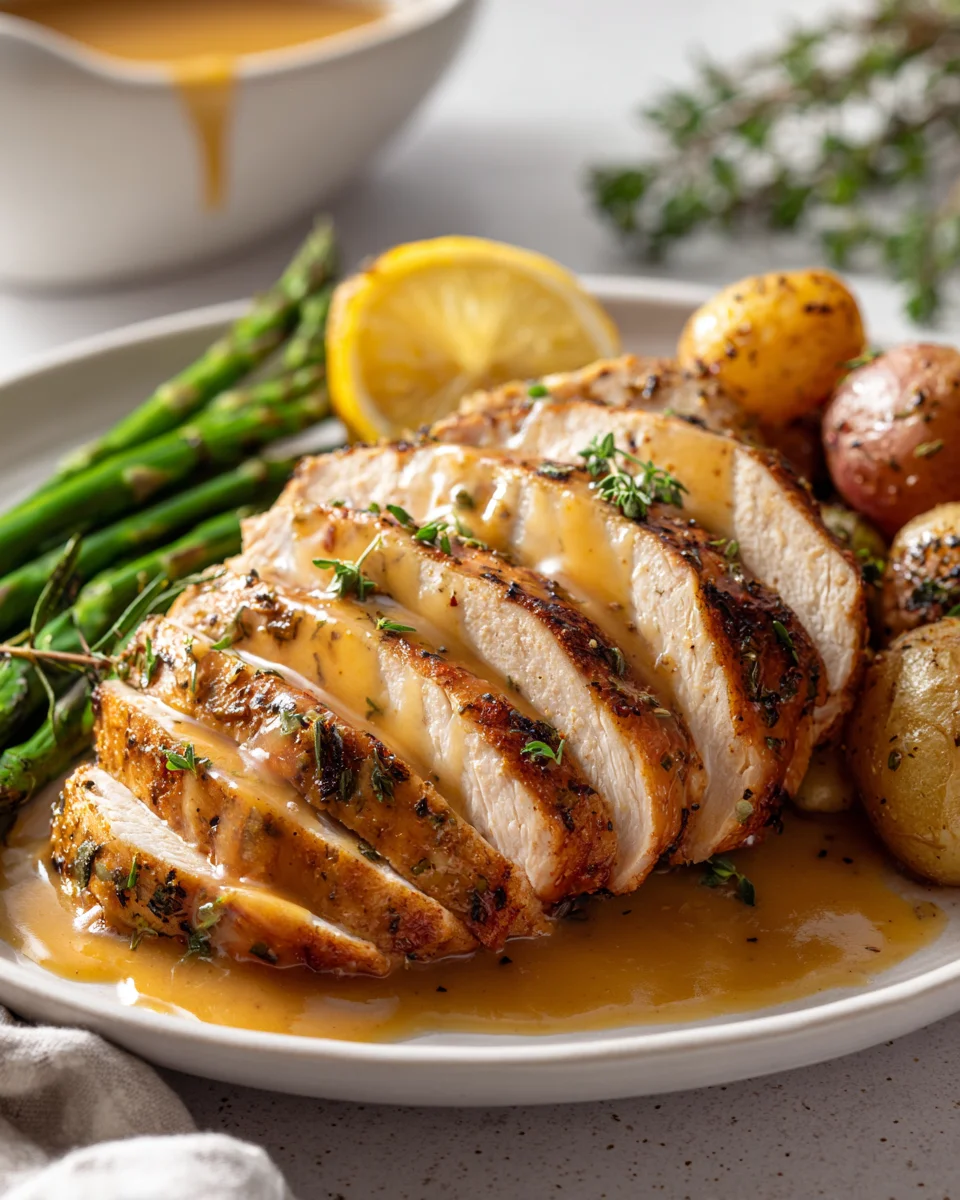 After its well-deserved rest, carve your Garlic Herb Slow Cooker Turkey Breast against the grain into thick, juicy slices. Arrange the slices beautifully on a serving platter. Garnish with a sprinkle of fresh chopped parsley if desired. Serve immediately with the warm, flavorful gravy on the side.