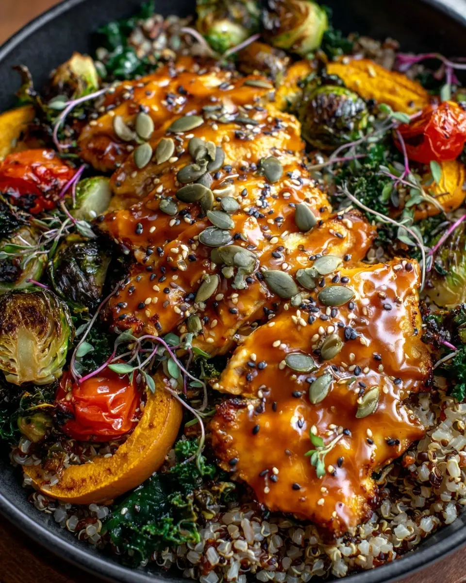 The chicken is marinated in this sauce, grilled or pan-seared until tender, then drizzled with more glaze for that glossy finish. It’s layered over a base of quinoa, rice, or even cauliflower rice, and rounded out with roasted vegetables—Brussels sprouts, carrots, kale, or whatever’s in season.