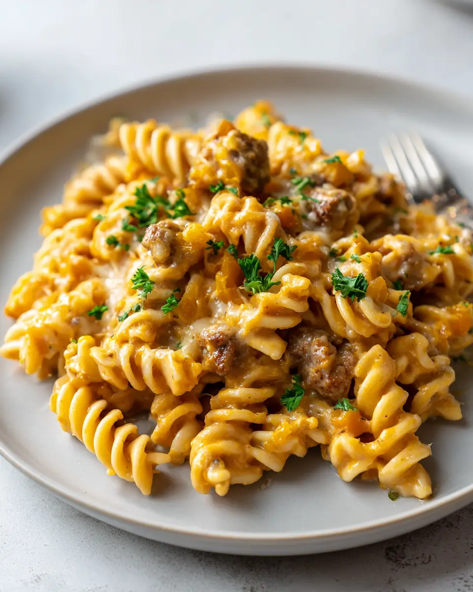 A creamy and comforting one pan pasta bake made with butternut squash, sausage, and a rich Parmesan cream sauce. Easy to make, full of flavor, and perfect for weeknights.
