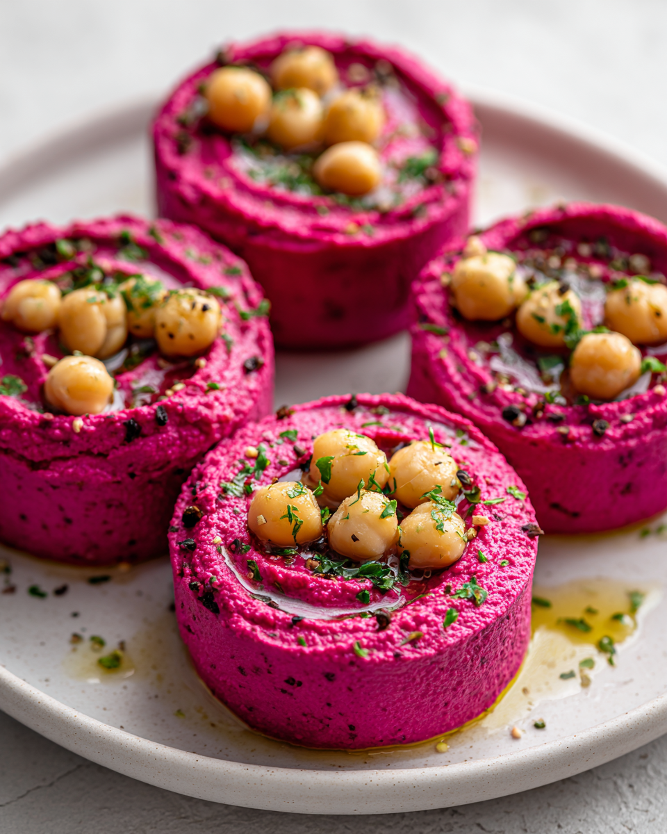 This recipe is a fun twist on classic hummus. Instead of serving it in a bowl, you portion it into individual cups for a colorful and convenient way to enjoy. The hummus is made from roasted beets, chickpeas, tahini, garlic, lemon juice, and olive oil blended into a creamy, smooth dip with a slightly sweet, earthy flavor and a gorgeous magenta hue.