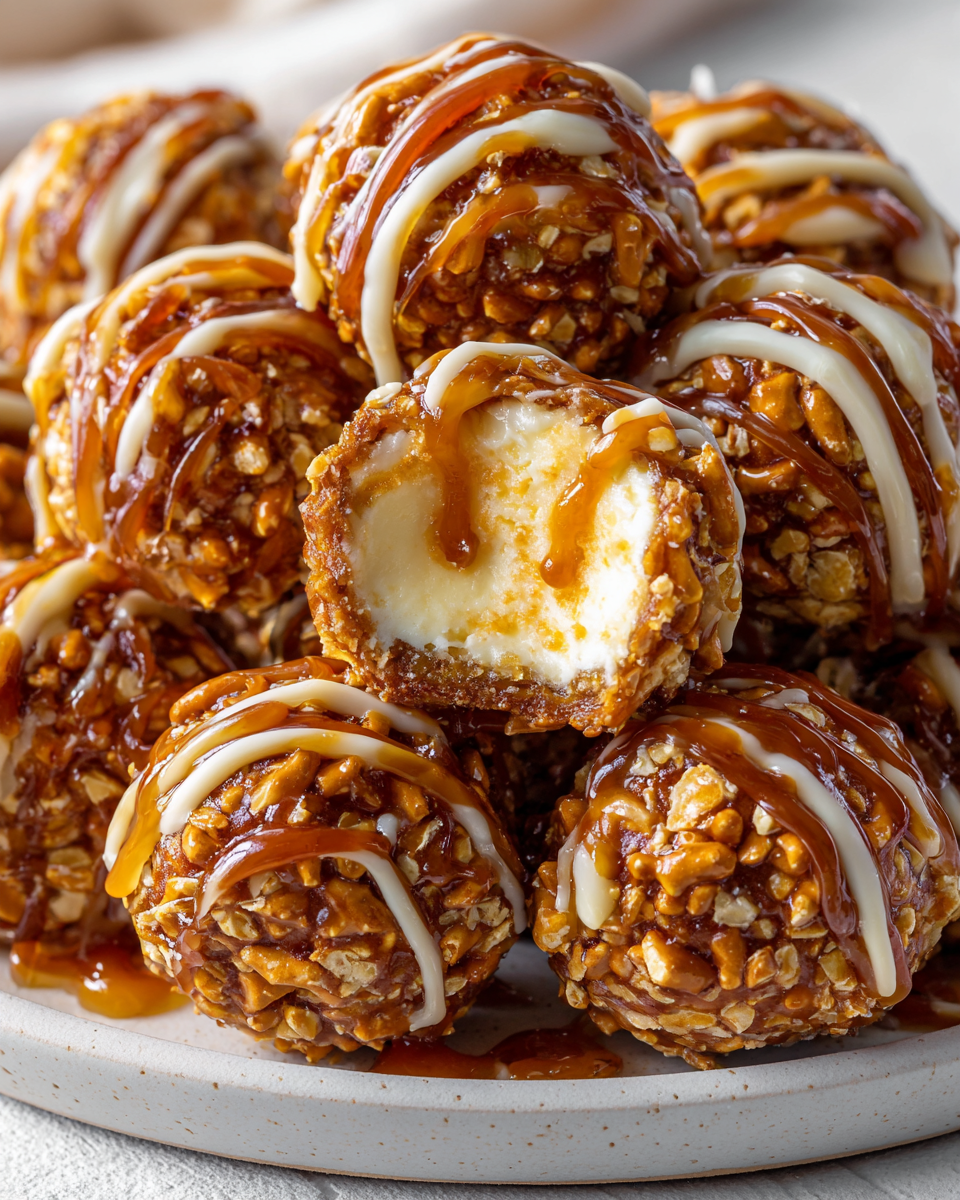 This idea came to life after a weekend kitchen experiment with leftover caramel sauce and crushed pretzels from a snack board. I folded in softened cream cheese, dipped each creamy center in melted caramel, rolled them in pretzel-oat clusters, and finished with a drizzle of white chocolate. The result? A rich cheesecake center with an irresistible crunch and caramel coating. They vanished in minutes.