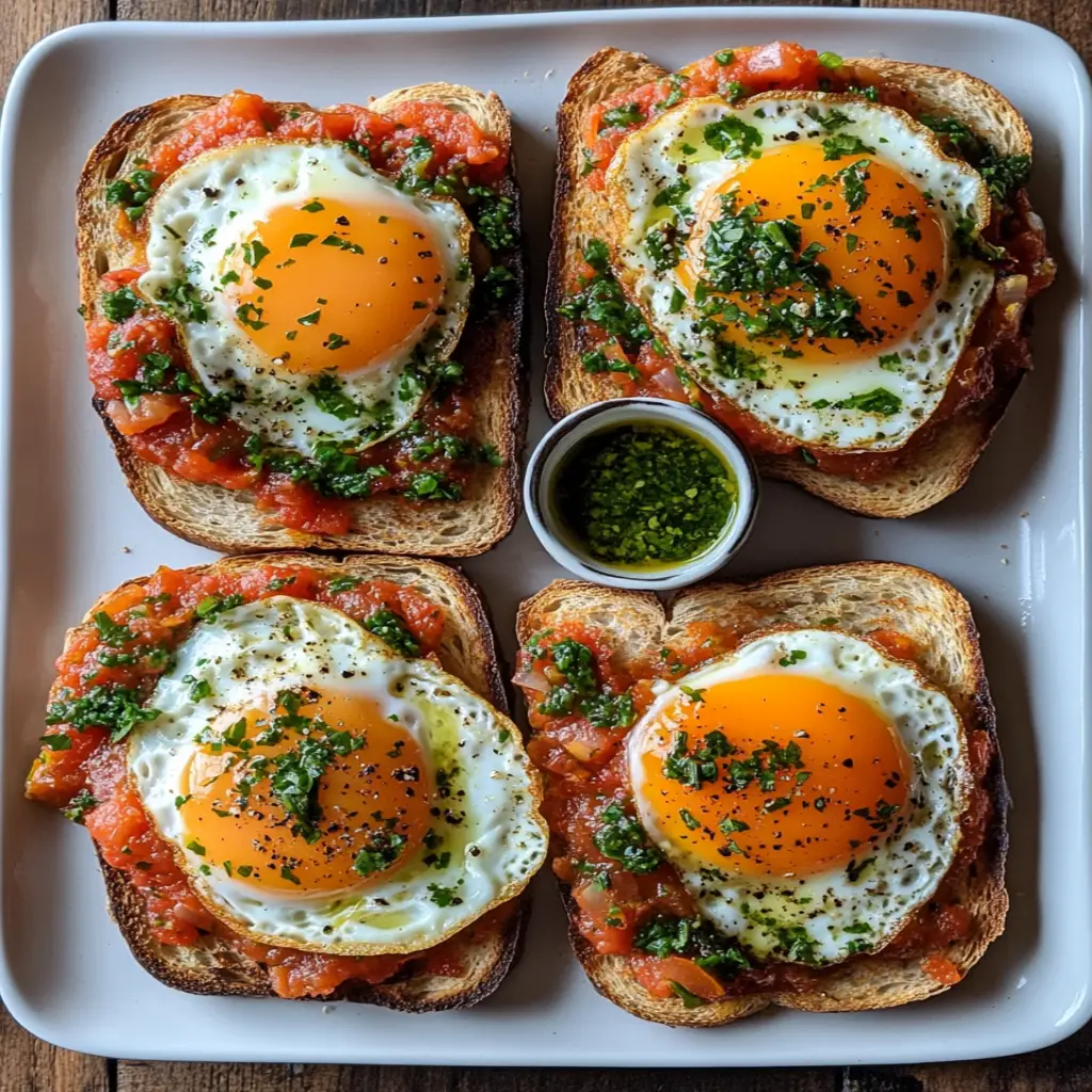 Each bite is an explosion of flavors: the tomato sauce is tangy and savory, with a touch of smokiness from paprika and warmth from cumin. The crispy toast provides crunch, while the runny egg yolk adds creamy richness that melds beautifully with the tomato base. Fresh herbs like cilantro or parsley brighten the dish, and a drizzle of chili oil or hot sauce adds optional heat. It’s hearty, flavorful, and deeply comforting without being heavy.