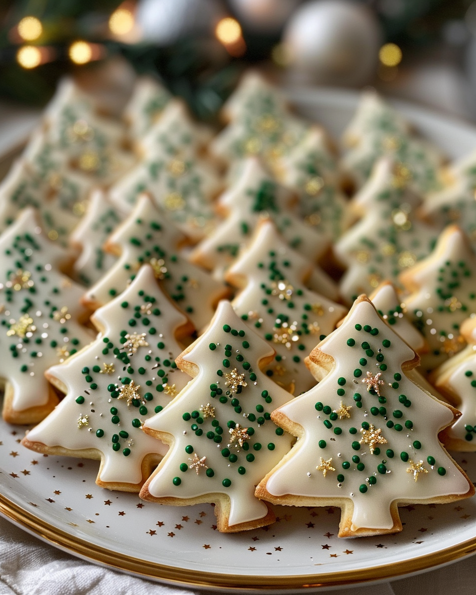 Buttery sugar cookies cut into Christmas tree shapes, iced with smooth royal icing, and sprinkled with glittering sugar and edible gold. A festive, elegant treat for holiday celebrations.