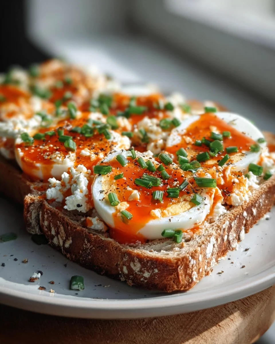 A delicious fusion of creamy cottage cheese, soft-boiled egg, and spicy Sriracha on crispy toast.
