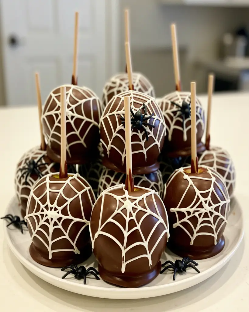 Spider Web Apples are festive chocolate-dipped apples decorated with white chocolate spiderwebs and spooky toppings. Perfect for Halloween parties and family fun.