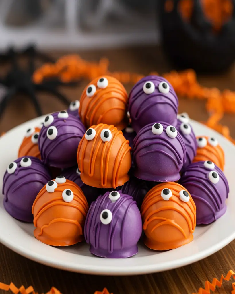 Spooky Oreo Truffles are a festive variation of classic Oreo truffles made with crushed Oreos and cream cheese, dipped in colorful candy melts, and decorated with candy eyeballs. Their Halloween twist makes them not just delicious but also fun and eye-catching for the holiday.