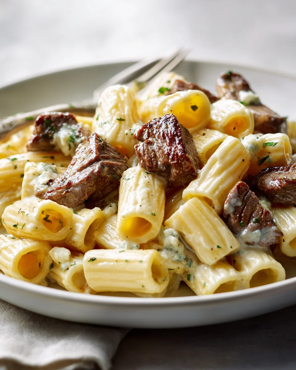 - In a large mixing bowl, combine the cooked rigatoni, the sliced steak, and the creamy blue cheese sauce. Toss gently until everything is evenly coated.