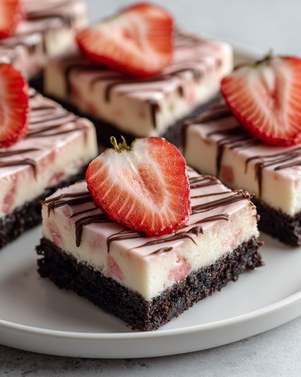 Strawberry cheesecake bars with a fudgy brownie crust, creamy vanilla cheesecake layer, strawberry swirl, chocolate drizzle, and fresh strawberry garnish. Makes 12–16 bars.