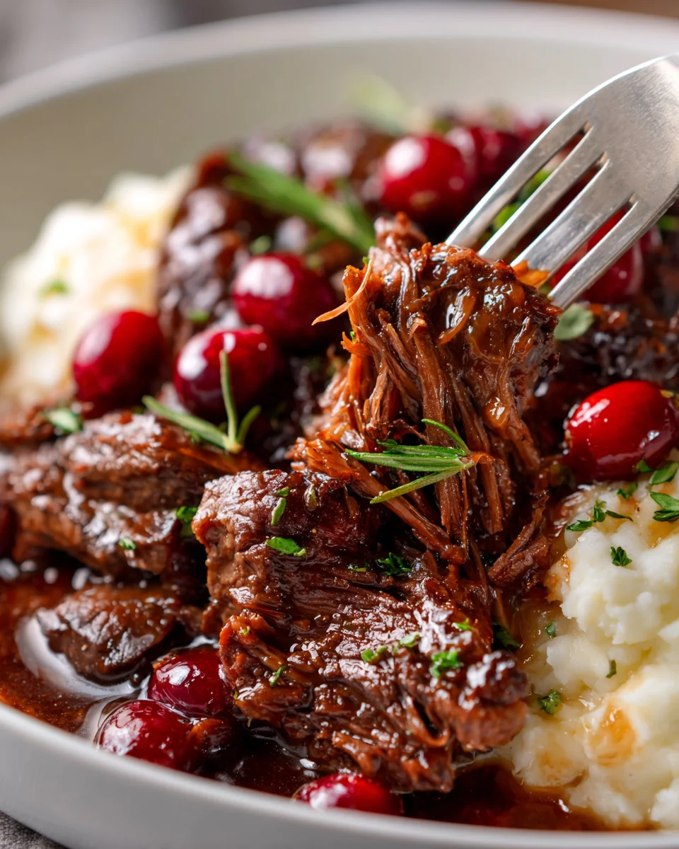 - Serve and Enjoy: Your Slow Braised Beef Roast With Cranberry Balsamic Glaze is now ready to be the star of your meal! I love serving this dish over creamy mashed potatoes or a rich polenta, as they provide the perfect canvas for soaking up all that incredible glaze. It’s also fantastic alongside roasted root vegetables or simple steamed green beans. Garnish with a few fresh cranberry halves or a sprig of fresh thyme for a touch of elegance. This dish is not just a meal; it’s an experience of comfort, depth, and unforgettable flavor. Enjoy every single tender, savory bite!