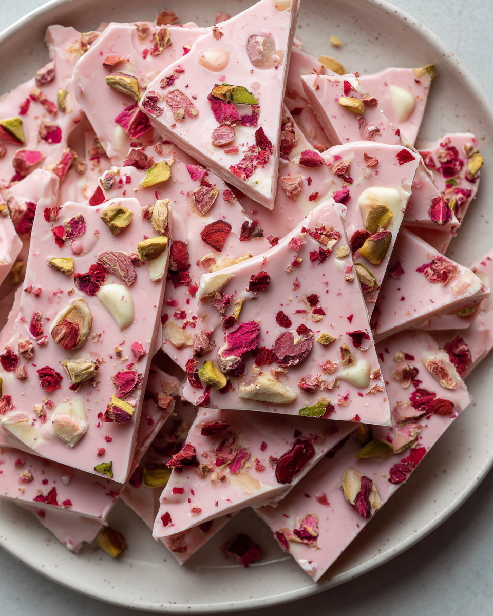 There’s something magical about pink and white chocolate together. The soft blush tones feel romantic and playful at the same time, while the creamy sweetness of white chocolate delivers instant comfort. Add in crunchy nuts, vibrant fruit, and delicate textures, and suddenly a few basic ingredients become something that looks handcrafted, thoughtful, and deeply personal. This bark doesn’t just taste good it feels special.