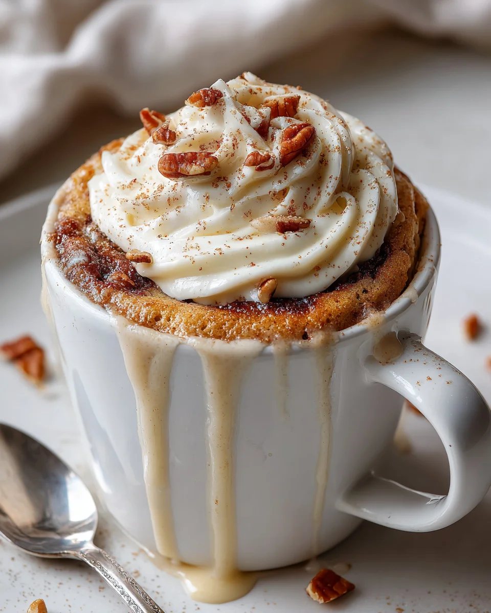 - Frosting Time: Once your mug cake has rested for a few minutes and is still wonderfully warm, spoon or drizzle the prepared cream cheese frosting generously over the top of the cake. The warmth of the cake will cause the frosting to slightly melt and spread, creating that irresistible gooey texture just like a traditional cinnamon roll. Don’t be shy with the frosting – it’s a key part of the experience!